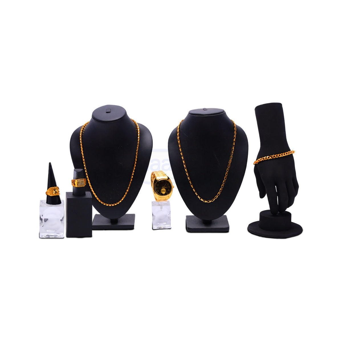 Step into elegance with this golden combo featuring a stylish watch, chains, rings, and bracelet. Perfect for parties, weddings, and daily wear, this set adds a royal charm to every look.