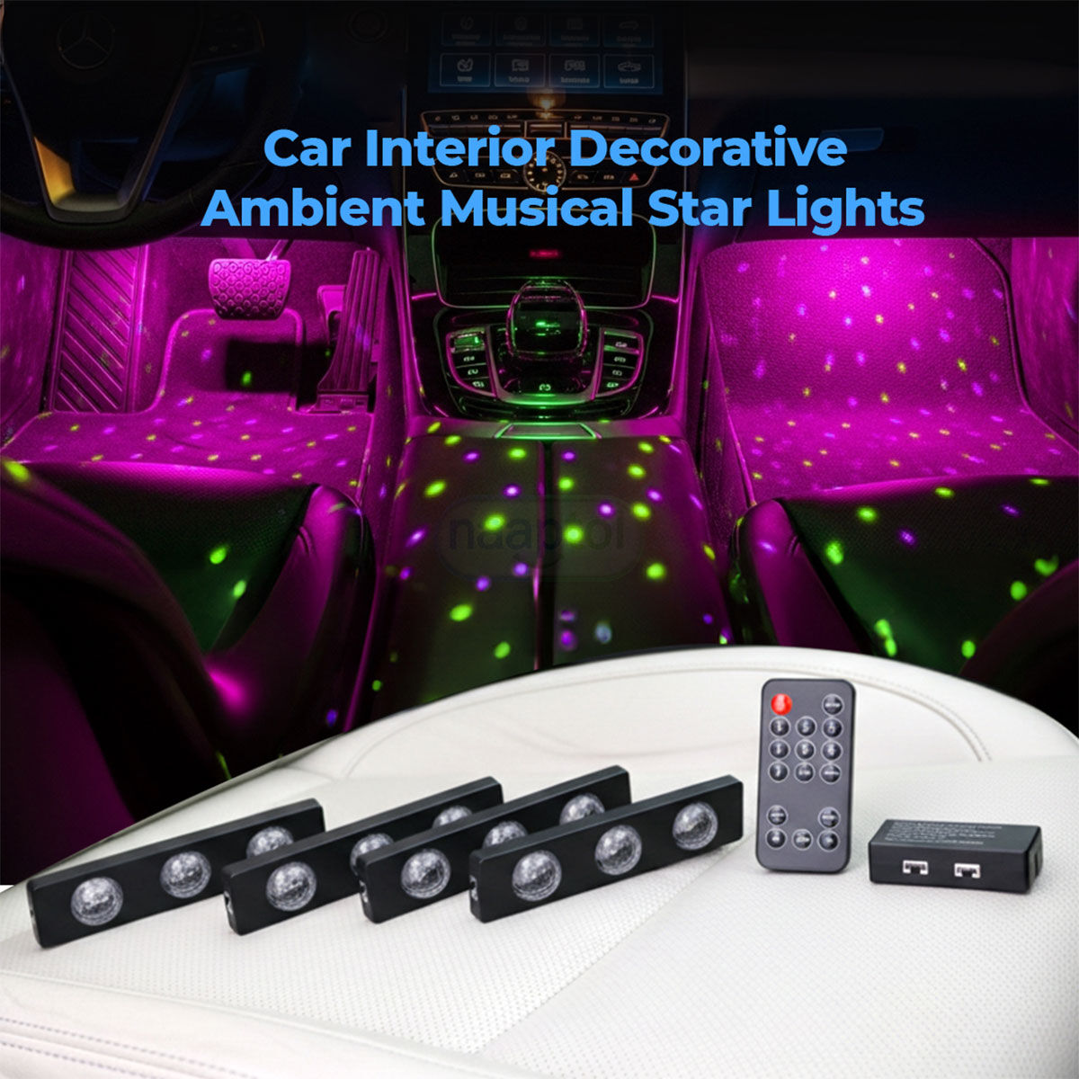 Transform your cars interior into a breathtaking starry paradise with the Car Interior Decorative Ambient Musical Star Lights. This pack of 4 premium RGB LED lights features built in music sensor technology that makes the diamond ring crystal lampshades pulse and change colors in perfect sync with your audio, creating an immersive concert like atmosphere on every drive. Choose from 7 vibrant colors, breathing, flashing, or cycle modes via the included remote, and enjoy smooth multi color transitions along with two music sync sensitivities for the ultimate customization. Super easy plug-and-play USB-powered installation with dual Velcro stickers lets you place them in footwells, dashboard, under seats, or door sills in minutes, no wiring or tools required. Safe, energy efficient, and built to last, these lights add premium ambiance, better nighttime visibility, and a luxurious glowing star effect that turns any ordinary vehicle into an extraordinary ride.